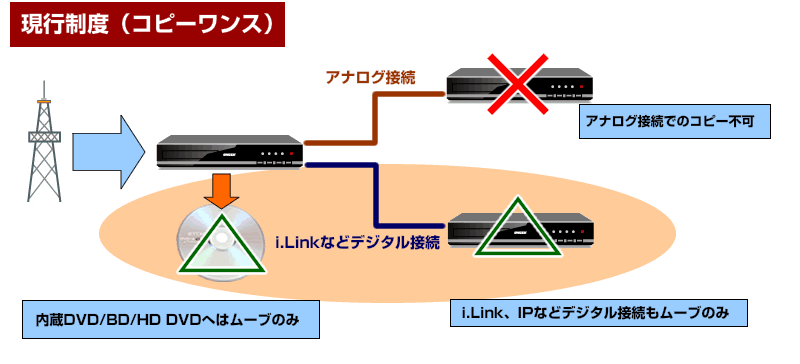 現行のコピーワンスの場合。DVDや他機器へはムーブのみ。アナログ接続でのコピーもできない