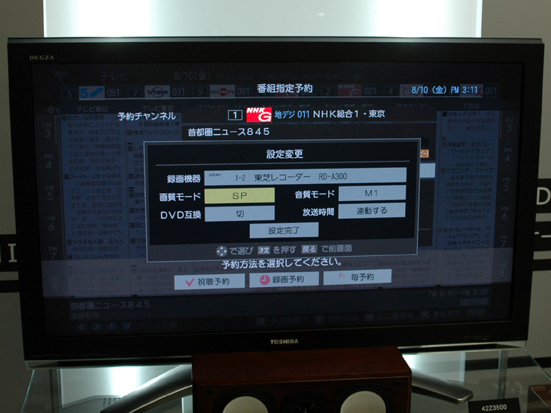 レグザの番組表からの録画予約で録画先を選択しているところ