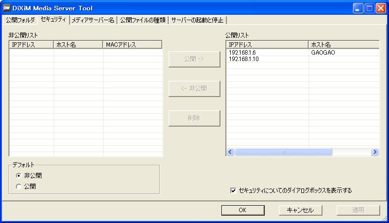 セキュリティページでは、DLNAクライアントのアクセス許可、不許可を変更することができる