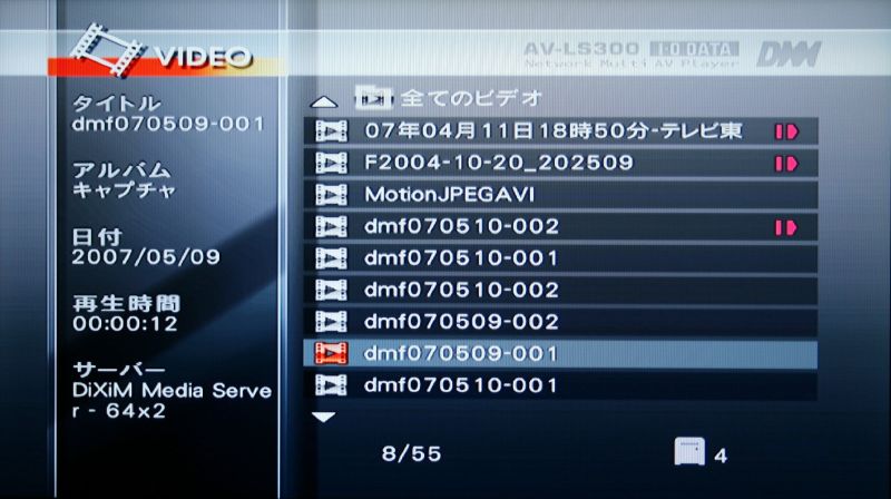 目的の動画を選択すると、そのファイルが再生される。画面の左に、選択しているコンテンツが「64x2」というPCの「DiximMediaServer」で公開されていることが表示されていることがわかる