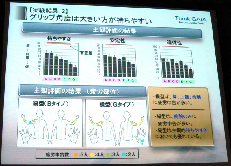 実験の結果、グリップ角度は大きい方が持ちやすいとの結果が出た