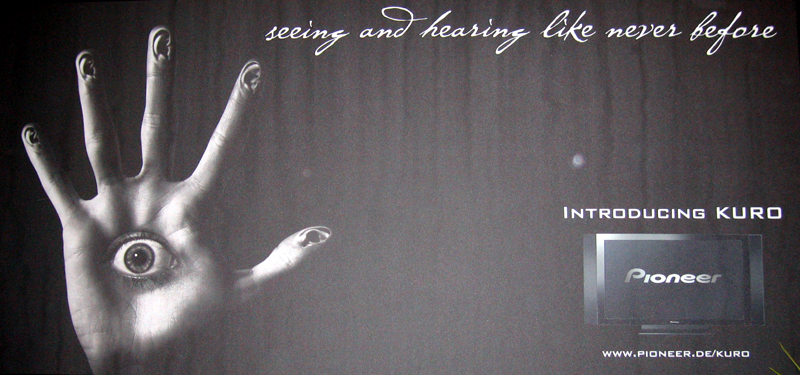 パイオニアの新プラズマテレビKUROの欧米向けキービジュアル(その3)。手のひらに目玉。ギョッとして何だろうと思わせる看板だ