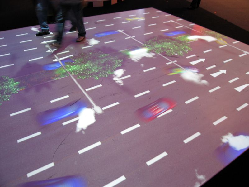 床面前面にシームレスに投影されたアニメーション動画。車が縦横無尽に走り回っている