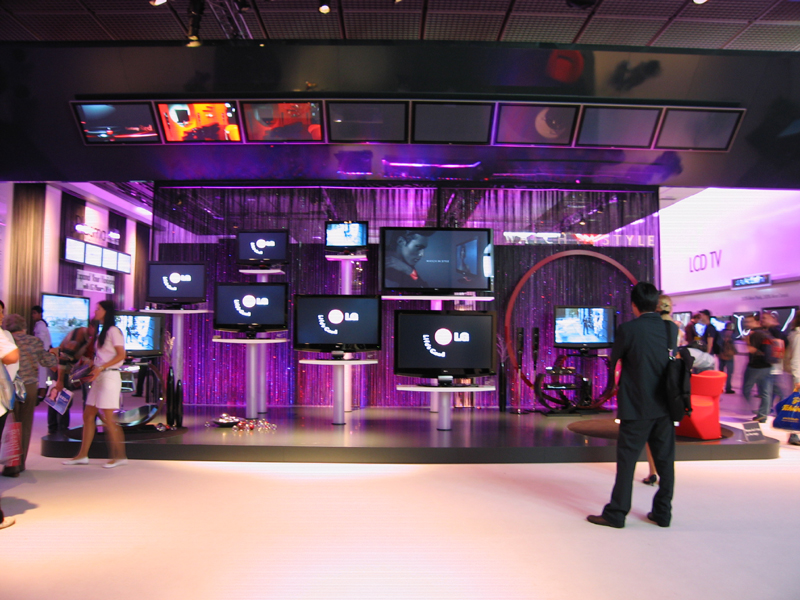 液晶テレビに映し出されるLG マークが出迎えるブース入口