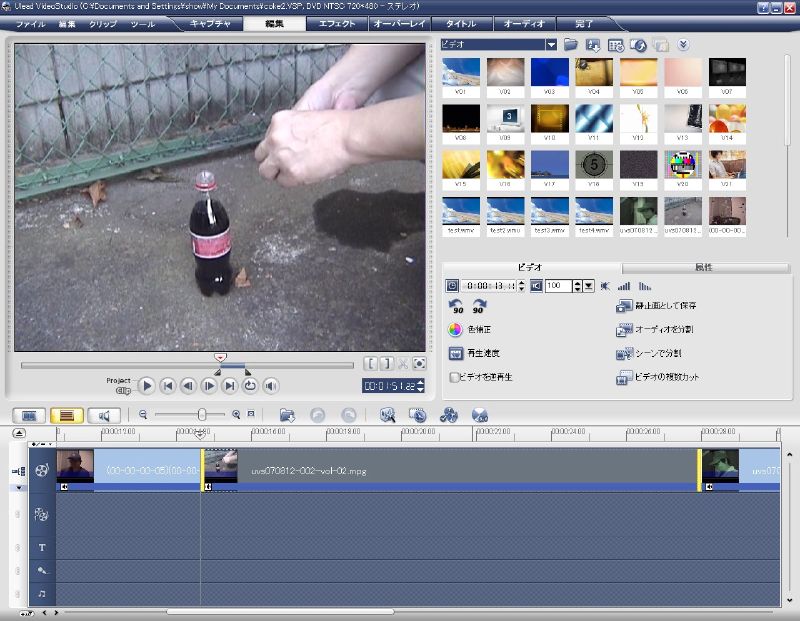 タイムライン表示したところ。単に取り込んだだけでは前後の無駄なカットが多いため、シーンごとにできるだけ前後をトリミングしているのが、プレビューウィンドゥの下のマークイン、マークアウトを見るとわかる