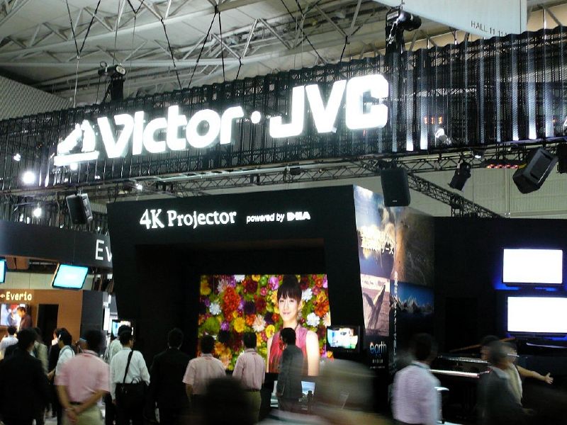 ビクターブースの入り口にスクリーンを設置して背面からの投影で4kプロジェクターのデモを実施していた