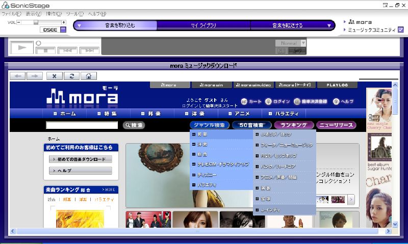 Mora。ウェブページとして表示され、ジャンル選択などはページ上のメニューとして実装されている