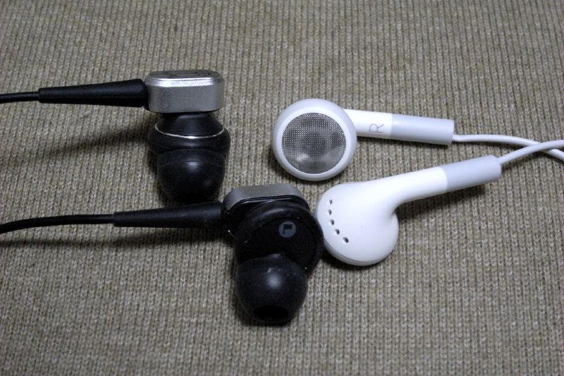 iPodのイヤホンはシリーズ共通の「例の白いヤツ」。NW-A919のイヤホンは同社EXモニターシリーズをベースにノイズキャンセルを搭載している