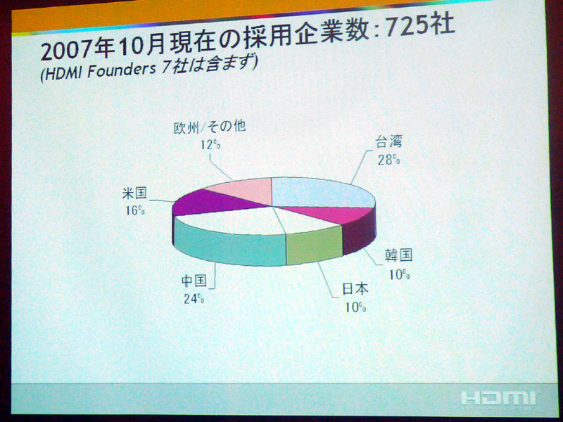 HOME > ニュース > AV&ホームシアターニュース HDMIの仕様表記ガイドラインが決定 − ケーブルはStandard/High Speedの2種類を規定 2007年10月17日 前の写真へ 次の写真へ HDMI採用企業の地域別の比率 前の写真へ 次の写真へ この写真の記事へ 関連リンク HDMI Licensing, LLC