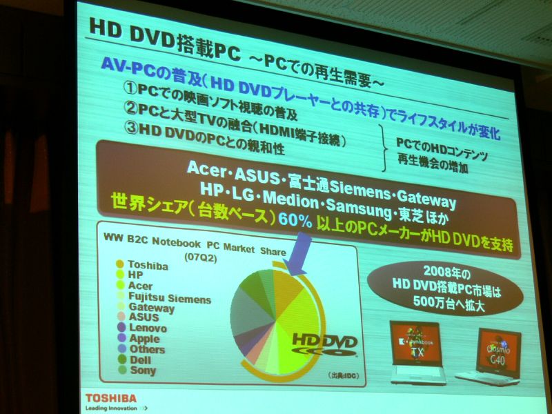 2008年にはHD DVD搭載PCが500万台出荷されると予想