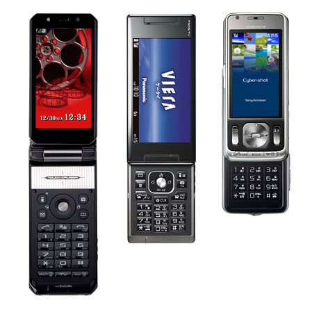 左からAQUOSケータイ、VIERAケータイ、Cyber-shotケータイ