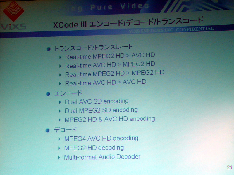 HOME > ニュース > AV&ホームシアターニュース ViXS、AVCREC/HD Recに対応するH.264トランスコーダー“XCodeIII”を開発 2007年11月13日 前の写真へ 次の写真へ XCode IIIで可能となるトランスコード/エンコード/デコード 前の写真へ 次の写真へ この写真の記事へ 関連リンク ViXS Systems(英文)