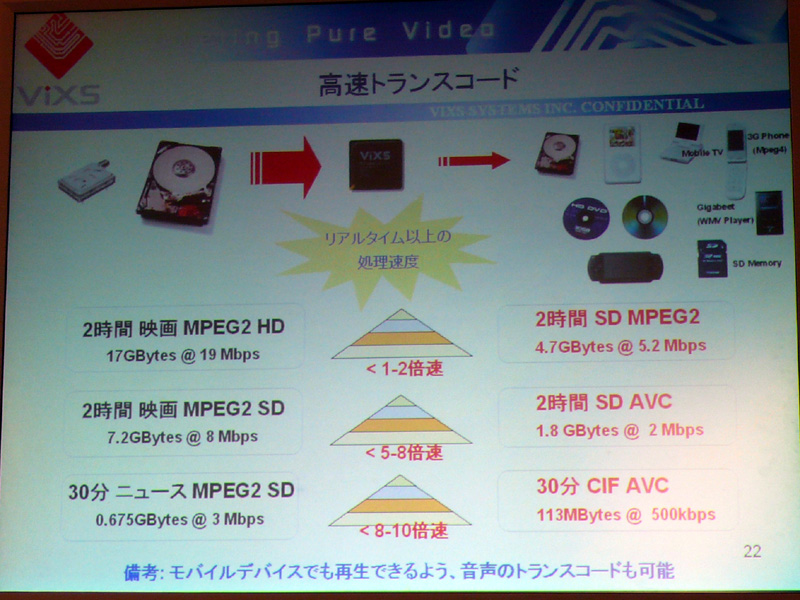 HOME > ニュース > AV&ホームシアターニュース ViXS、AVCREC/HD Recに対応するH.264トランスコーダー“XCodeIII”を開発 2007年11月13日 前の写真へ 次の写真へ トランスコード速度の例 前の写真へ 次の写真へ この写真の記事へ 関連リンク ViXS Systems(英文)