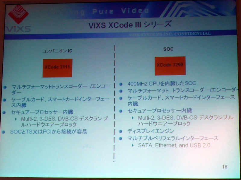 HOME > ニュース > AV&ホームシアターニュース ViXS、AVCREC/HD Recに対応するH.264トランスコーダー“XCodeIII”を開発 2007年11月13日 前の写真へ 次の写真へ 「XC3111」「XC3290」の機能比較 前の写真へ 次の写真へ この写真の記事へ 関連リンク ViXS Systems(英文)