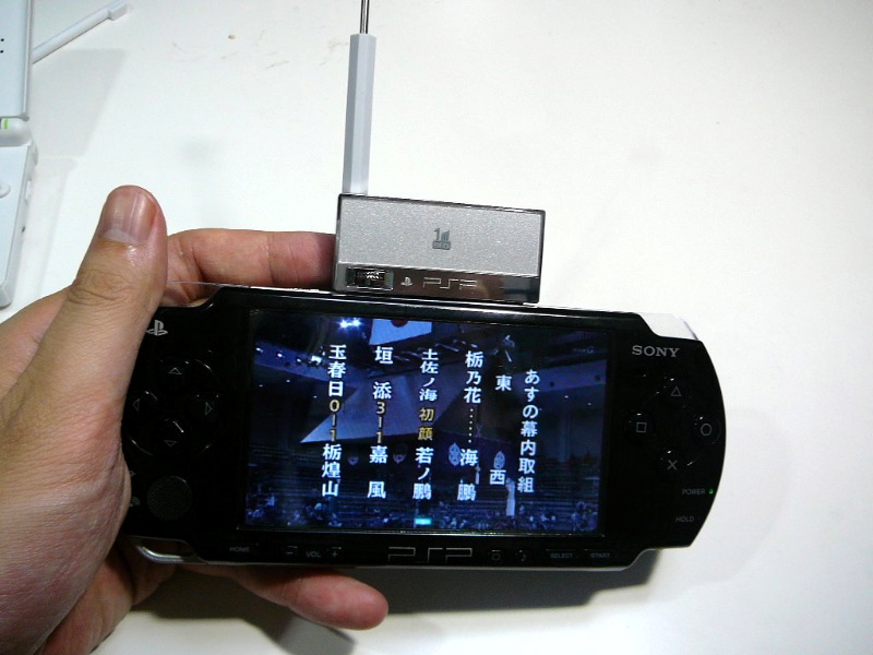 PSPの「ワンセグチューナー」。重量は軽いもの、片手で持つにはやや重量バランスが悪い