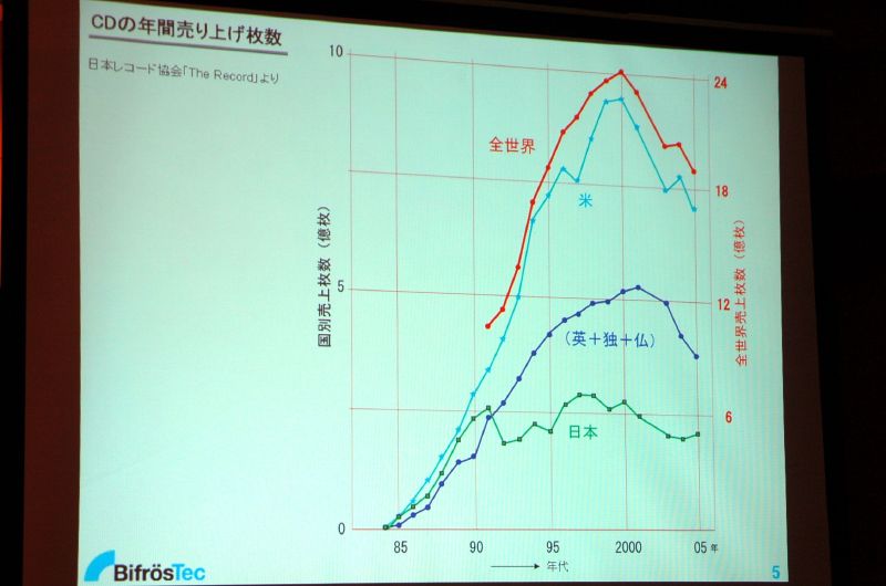 HOME > ニュース > AV&ホームシアターニュース 今日は「音の日」 - CD発売25周年を記念し“CDの父”中島平太郎氏が記念講演 2007年12月06日 前の写真へ 世界規模でのCDの売上は2000年前後をピークに下がっているが、ロシア、中国、トルコなどでは上昇しているという 前の写真へ この写真の記事へ 関連リンク 日本オーディオ協会 日本レコード協会 CDs21ソリューションズ