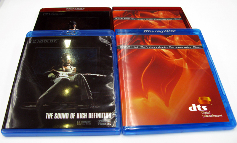 左がドルビーのデモディスク(手前がBD、奥がHD DVD)。右が最新DTSデモディスク(手前がBD、奥がHD DVD)