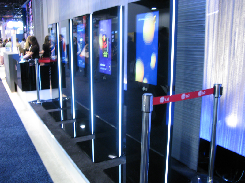 同じくLGブースの入口付近。液晶モニターを縦に使ったインフォメーションボードが並んだ