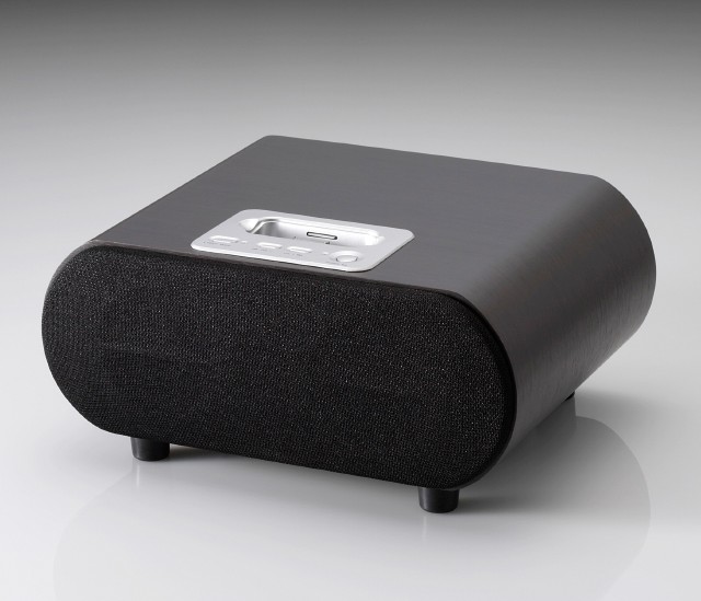 エレコム、木製キャビネットに2.1ch再生機能を搭載したiPodスピーカー