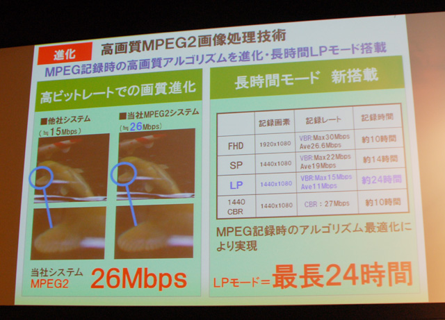MPEG2記録時の高画質アルゴリズムを進化。新設されたLPモードでは最長24時間のハイビジョン映像が撮影できる