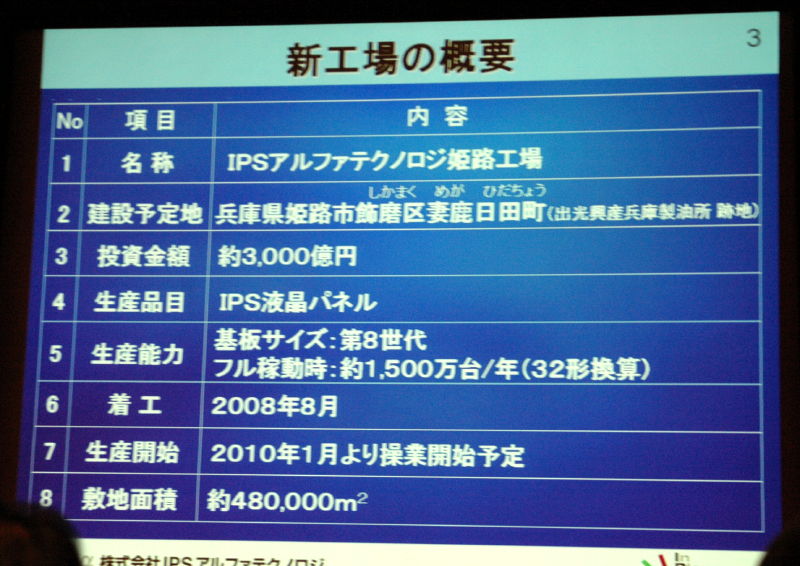 IPSアルファ、2010年に姫路新工場を稼働 − 3,000億投資で年産約1,500万枚へ