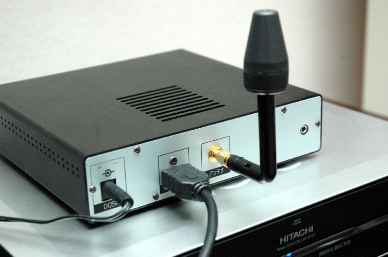 ワイヤレスユニットの背面。電源とHDMI入力、アンテナのみとシンプルな構成