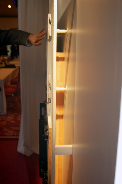 新取り付け金具(写真上部)。中面の壁にも固定することによりテレビの質量を分散させ、壁補強せずに設置することを可能にした