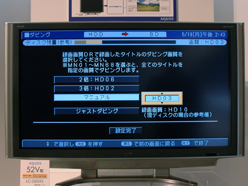 ダビングする際の画質は「ハイビジョンジャストダビング」機能で自動的に割り振られるほか、好みで設定することも可能だ