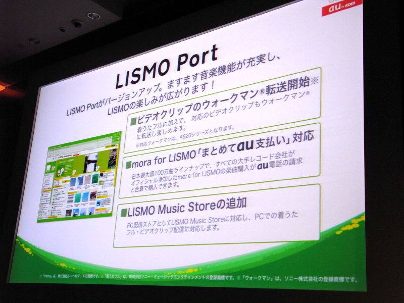 HOME > ニュース > AV&ホームシアターニュース ケータイで楽しめる高画質動画サービス「LISMO Video」がスタート − KDDI夏モデル発表会詳報 2008年06月03日 前の写真へ 次の写真へ LISMO Portが充実 前の写真へ 次の写真へ この写真の記事へ 関連リンク 新モデルの紹介ページ LISMO Videoのニュースリリース