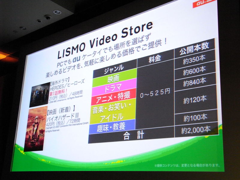HOME > ニュース > AV&ホームシアターニュース ケータイで楽しめる高画質動画サービス「LISMO Video」がスタート − KDDI夏モデル発表会詳報 2008年06月03日 前の写真へ 次の写真へ LISMO Video Storeで配信されるコンテンツ内容 前の写真へ 次の写真へ この写真の記事へ 関連リンク 新モデルの紹介ページ LISMO Videoのニュースリリース