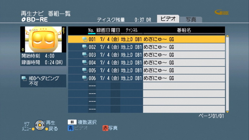 1枚のディスクにひたすらダビングを繰り返した。ちなみに1層25GBに「めざにゅ〜」は8個まで入った