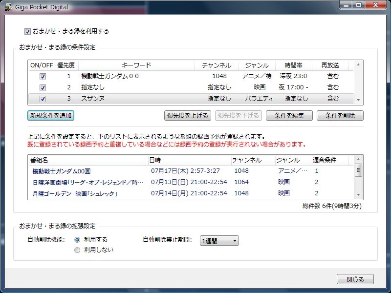 おまかせ・まる録はいくつも条件を設定可能。1日〜4週間の範囲で録画を自動削除するようにも設定できるため、自動録画でHDDがパンクするのをふせぐことができる