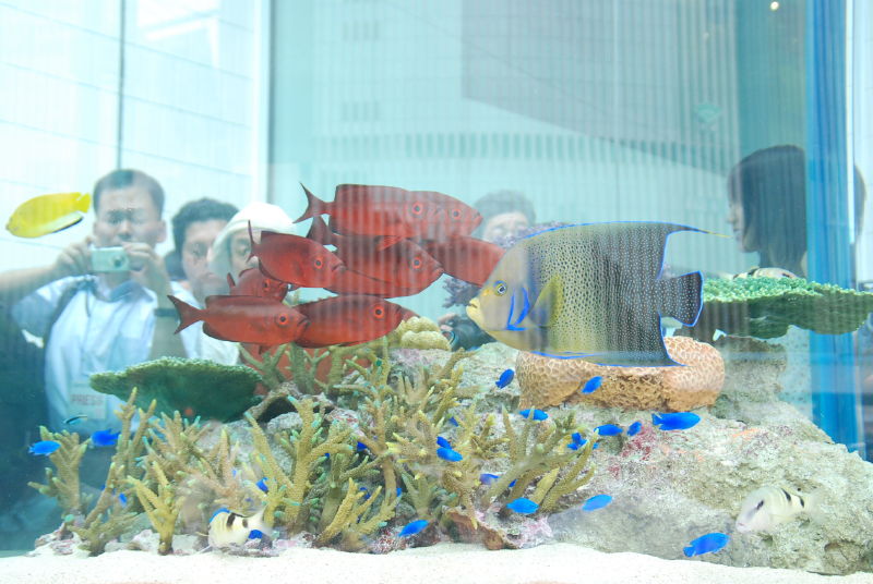 水槽には沖縄の海の生き物が涼しげに泳いでいる