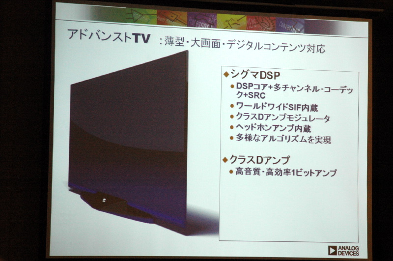 HOME > ニュース > AV&ホームシアターニュース アナログ・デバイセズ、オーディオ向け製品の説明会を開催 2008年07月25日 前の写真へ 次の写真へ 薄型テレビにも同社製品の採用を働きかける 前の写真へ 次の写真へ この写真の記事へ 関連リンク アナログ・デバイセズ