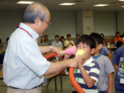 音の速度の体感実験。90mの管に向けて発した声が、遅れて聞こえてくるのを確かめる