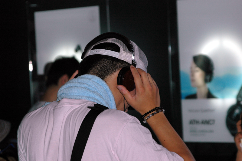 同社ヘッドホンで曲に聴き入る来場者
