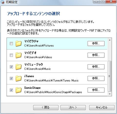 転送に設定するフォルダを選択する。iTunesやSonicStageのフォルダが選択できるのがわかる