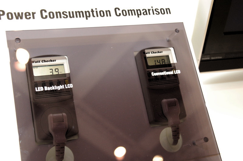 LEDバックライトコントロールによる、低消費電力実現のメリットをアピール。左が参考技術を搭載したモデルの数値で、瞬間では3分の1近くにまで省電力を実現している