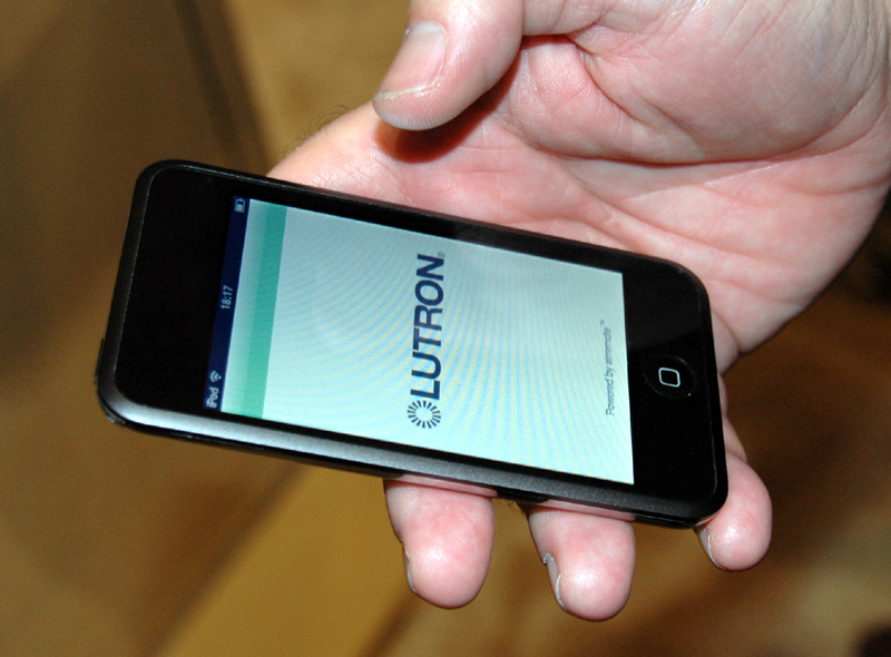 同社ロジャー・スタム氏がポケットから取り出したiPod Touch。ルートロンのコントローラーとしてカスタマイズされている
