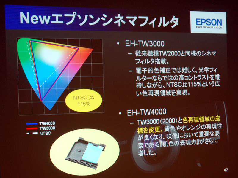 NEWエプソンシネマフィルタについての説明。ED-TW3000は従来機のEMP-TW2000と同様のものだが、EH-TW4000では座標軸を変更し黄色やオレンジの再現性が向上した