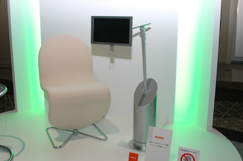 可動アーム式のスピーカーを取り付けたフロアスタンド型スタイルのテレビ試作機
