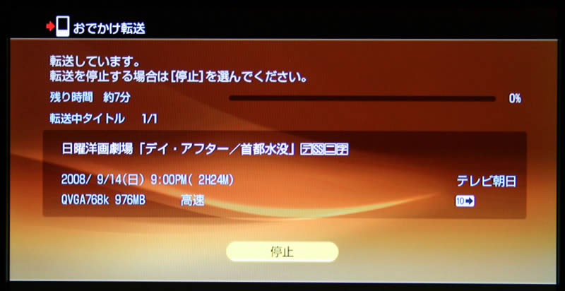 おでかけ転送中の画面。2時間24分の768kタイトルの高速転送に約7分がかかる