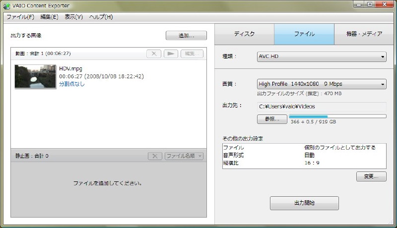ビデオ形式変換ソフト「VAIO Content Explorer」