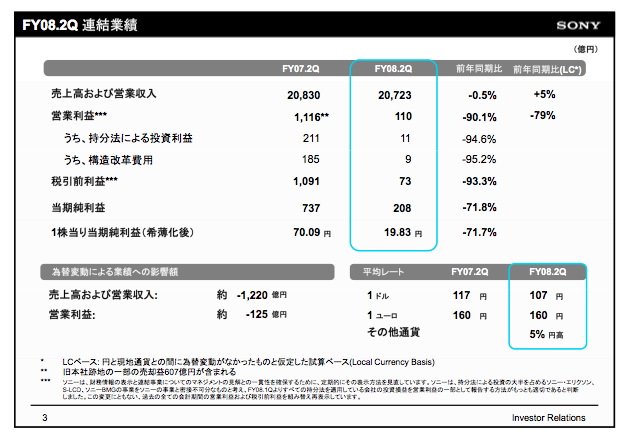 HOME > ニュース > AV&ホームシアターニュース PS3は前年比2倍以上の売り上げ ソニー、第2四半期決算は営業利益が前年比9割減に Phile-web編集部 2008年10月29日 次の写真へ 2008年度第2四半期の連結業績 次の写真へ この写真の記事へ 関連リンク ソニー(株) 本件のニュースリリース