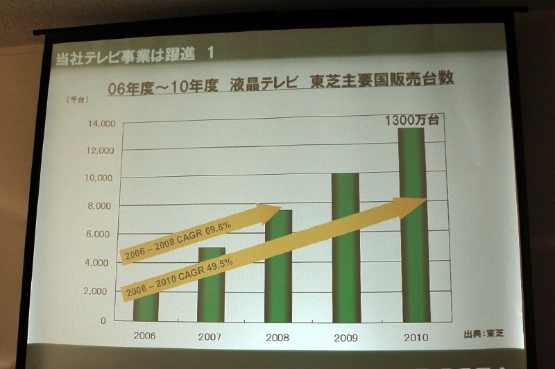東芝の出典による「06年度から10年度の液晶テレビ 東芝主要国販売台数」予測