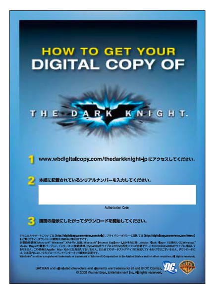 HOME > ニュース > AV&ホームシアターニュース PCやポータブル機器で本編の再生が可能 ワーナー、「ダークナイト」BD/DVD購入者に本編映像のダウンロード権を提供 Phile-web編集部 2008年12月05日 封入カードのイメージ この写真の記事へ 関連リンク ワーナー・ホーム・ビデオ