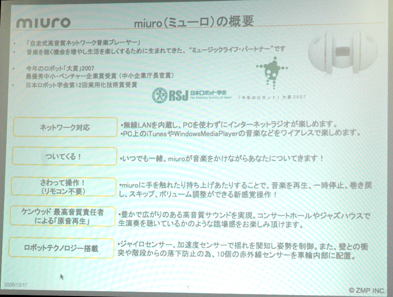 HOME > ニュース > AV&ホームシアターニュース 次世代の“音楽プラットフォーム”に ZMP、音楽再生ロボ「miuro」の新機能を発表 − 首都大学東京と共同研究 Phile-web編集部 2008年12月17日 前の写真へ 次の写真へ miuroの概要 前の写真へ 次の写真へ この写真の記事へ 関連リンク miuro ホームページ (株)ゼットエムピー