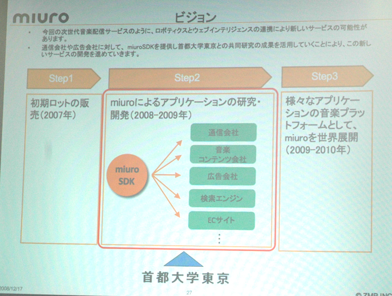 HOME > ニュース > AV&ホームシアターニュース 次世代の“音楽プラットフォーム”に ZMP、音楽再生ロボ「miuro」の新機能を発表 − 首都大学東京と共同研究 Phile-web編集部 2008年12月17日 前の写真へ miuroを核に今後さまざまなサービスの展開を考えているという 前の写真へ この写真の記事へ 関連リンク miuro ホームページ (株)ゼットエムピー