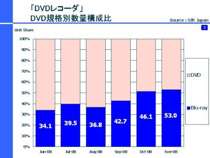 HOME > ニュース > AV&ホームシアターニュース 低価格化が後押し BDレコーダーが急速にシェア拡大 − GfK 11月度調査で5割超、BCNの金額シェアでは8割弱 Phile-web編集部 2008年12月19日 次の写真へ BDAが発表したGfKの集計データ。11月度のBDレコーダー台数構成比は53%となった 次の写真へ この写真の記事へ 関連リンク ブルーレイ・ディスク・アソシエーション(BDA) BCN発表のニュースリリース