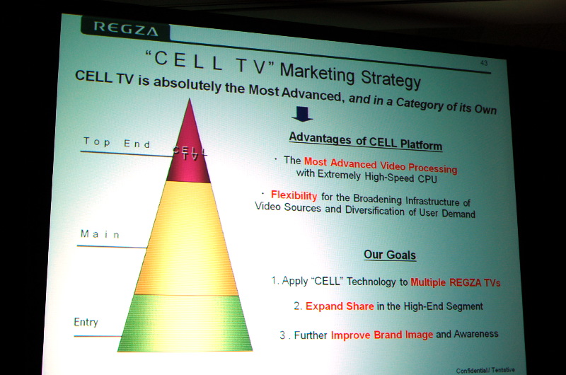 HOME > ニュース > AV&ホームシアターニュース CES2009レポート <東芝プレスカンファレンス>CELL TVの詳細を明らかに − 2010年には4K2Kモデルも投入予定 Phile-web編集部・風間 2009年01月08日 前の写真へ 次の写真へ CELL TVはREGZAのトップエンドという位置づけ。その下の「Main」はREGZAブランドを冠した製品、「Entry」は“Non-REGZA 前の写真へ 次の写真へ この写真の記事へ 関連リンク International CES 2009ホームページ CES 2009レポート一覧